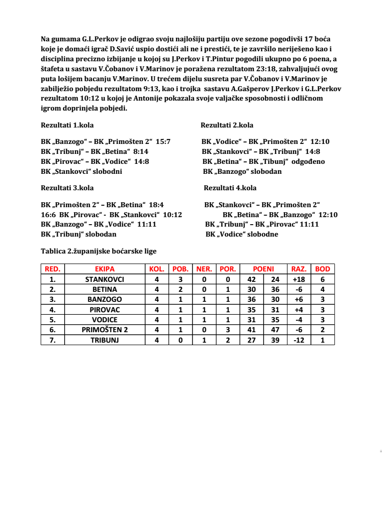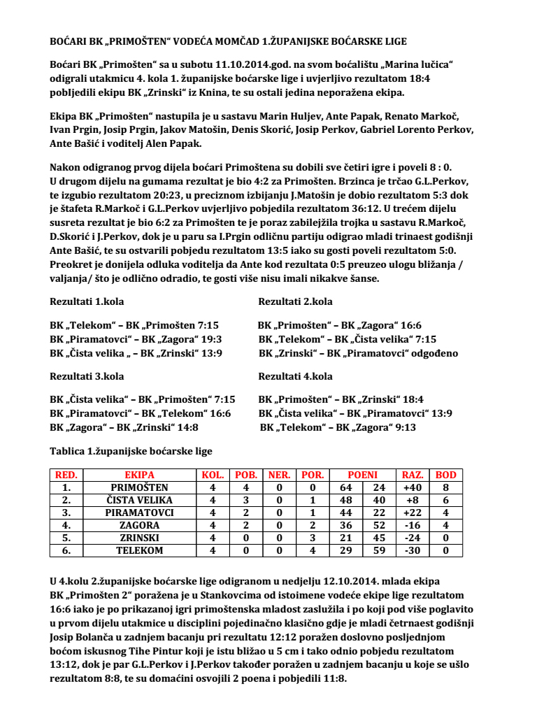 Boćari BK „PRIMOŠTEN“ vodeća momčad 1.Županijske boćarske lige