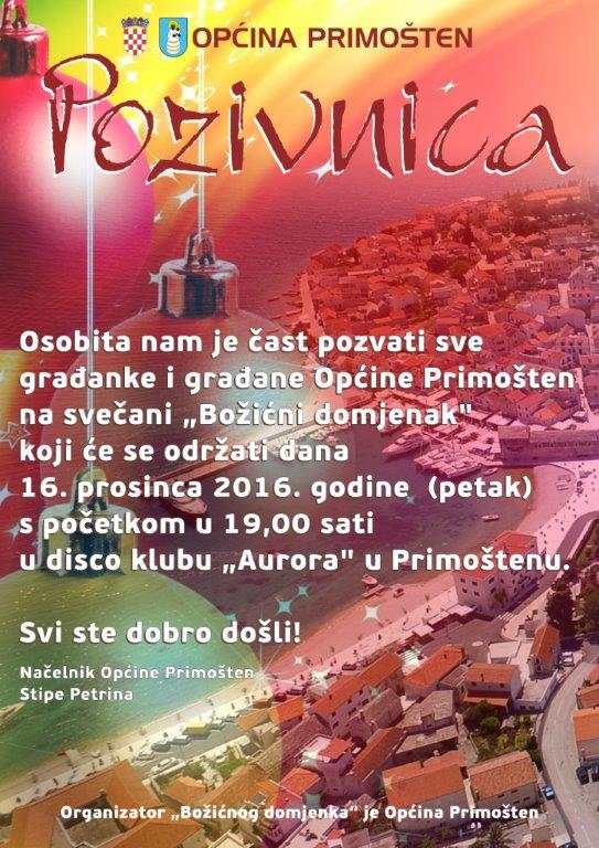 Općina Primošten poziva Vas na  na “Božićni domjenak” u Aurori dana 16.12.2016.(petak) u 19,00 sati.
