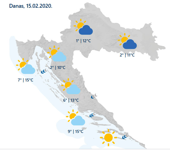 Na Jadranu te u krajevima uz Jadran će prevladavati sunčano. U središnjim i istočnim predjelima djelomice sunčano uz promjenljivu naoblaku. Ujutro mjestimice magla. Vjetar na kopnu većinom slab. Na Jadranu slaba i umjerena, još prijepodne ponegdje i jaka bura s olujnim udarima. Poslijepodne će mjestimice okrenuti na sjeverozapadnjak. Najviša od 8 do 14, na Jadranu i do 16 °C.