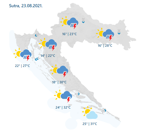 U noći i prijepodne na sjevernom Jadranu i zapadnim krajevima unuitrašnjosti naoblačenje s kišom i pljuskovima, kojih će poslijepodne biti i u istočnim karjevima. Ponegdje pljuskovi mogu biti i jače izraženi. U Dalmaciji djelomice sunčano i uglavnom suho. Zapuhat će mjestimice umjeren sjeverni i sjeveroistočni vjetar. Na sjevernom i dijelu srednjeg Jadrana zapuhat će umjerena i jaka bura, a na južnom dijelu zapadnjak i jugozapadnjak. Najniža jutarnja temperatura zraka od 13 do 18, na moru između 20 i 25. Najviša dnevna od 23 u zapadnim krajevima unutrašnjosti do 29 u istočnim, a na Jadranu od 27 do 32 °C.