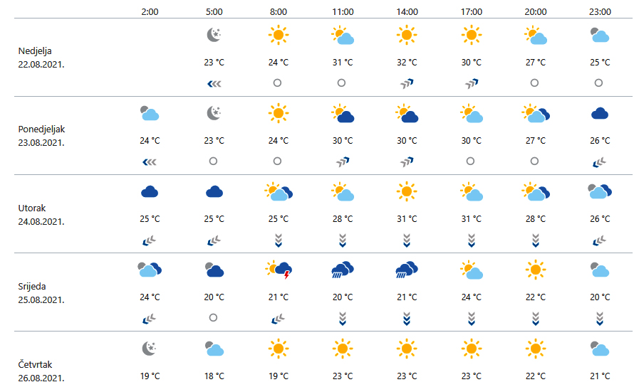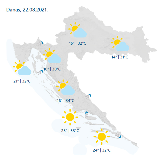Pretežno sunčano, u unutrašnjosti i na sjevernom Jadranu poslijepodne uz promjenjivu naoblaku. Vjetar na kopnu slab do umjeren jugozapadni i jugoistočni. Duž obale ujutro burin, danju jugozapadnjak, prema otvorenom moru sjeverozapadnjak, potkraj dana u okretanju na južni vjetar i jugo. Najviša dnevna temperatura uglavnom od 30 do 35 °C.