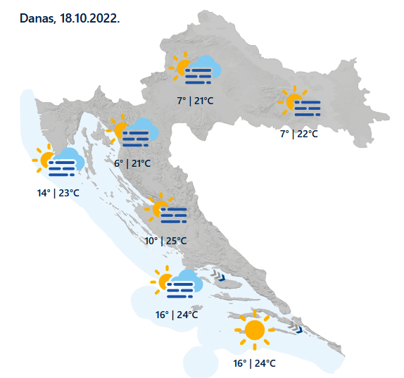 Sunčano, duž obale i vedro, a ujutro i prijepodne mjestimice magla i niska naoblaka. Vjetar većinom slab, na Jadranu mjestimice umjeren sjeverozapadni i zapadni. Najviša dnevna temperatura zraka od 20 do 25 °C.