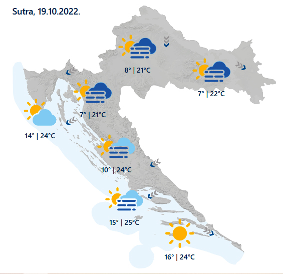 U noći i ujutro mjestimice magla i niski oblaci koji se lokalno mogu i dulje zadržati, potom u unutrašnjosti barem djelomice sunčano, dok će na moru biti i vedro. Prema večeri i osobito tijekom noći sa sjevera postupno jače naoblačenje, lokalno uz mogućnost za malo kiše u Gorskom kotaru. Vjetar slab do umjeren sjeverni i sjeverozapadni, na Jadranu i bura, podno Velebita s jakim udarima. Najniža jutarnja temperatura zraka na kopnu od 5 do 10, na moru od 12 do 17, a najviša dnevna uglavnom između 20 i 25 °C.
