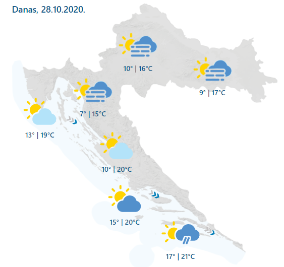 Djelomice, a na većem dijelu Jadrana i pretežno sunčano. Ujutro u Dalmaciji uz više oblaka još mjestimice kiša, osobito na otocima. U unutrašnjosti ujutro magla ili niski oblaci, a ponegdje se mogu i dulje zadržati. Vjetar slab, a na Jadranu umjeren, prema otvorenom i jak sjeverozapadni, uz obalu i bura. Najviša dnevna temperatura zraka uglavnom između 15 i 21 °C.
