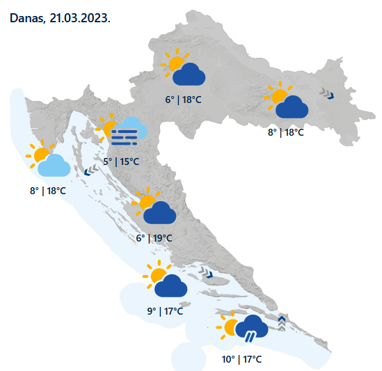 Djelomice i pretežno sunčano te u većini krajeva suho. Uz promjenljivu naoblaku u Slavoniji te na jugu očekuje se malo kiše ili poneki pljusak. Ujutro lokalno kratkotrajna magla. Vjetar na kopnu slab, na istoku do umjeren sjeverozapadni. Na Jadranu ujutro slaba do umjerena bura, zatim sjeverozapadni vjetar, uz obalu i jugozapadni. Najviša dnevna temperatura uglavnom od 15 do 19 °C.