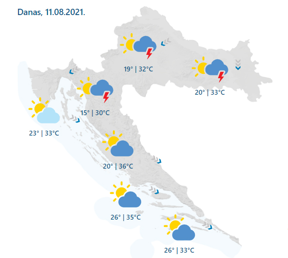 Pretežno sunčano i vruće, no nestabilno. Ponegdje kratkotrajna kiša pa i grmljavina, ponajprije u unutrašnjosti i češće sredinom dana i popodne. Lokalno pljuskovi mogu biti izraženiji. Vjetar slab do umjeren sjeveroistočni i sjeverni, na Jadranu sjeverozapadni, a navečer i bura. Najviša dnevna temperatura zraka uglavnom između 31 i 36 °C.