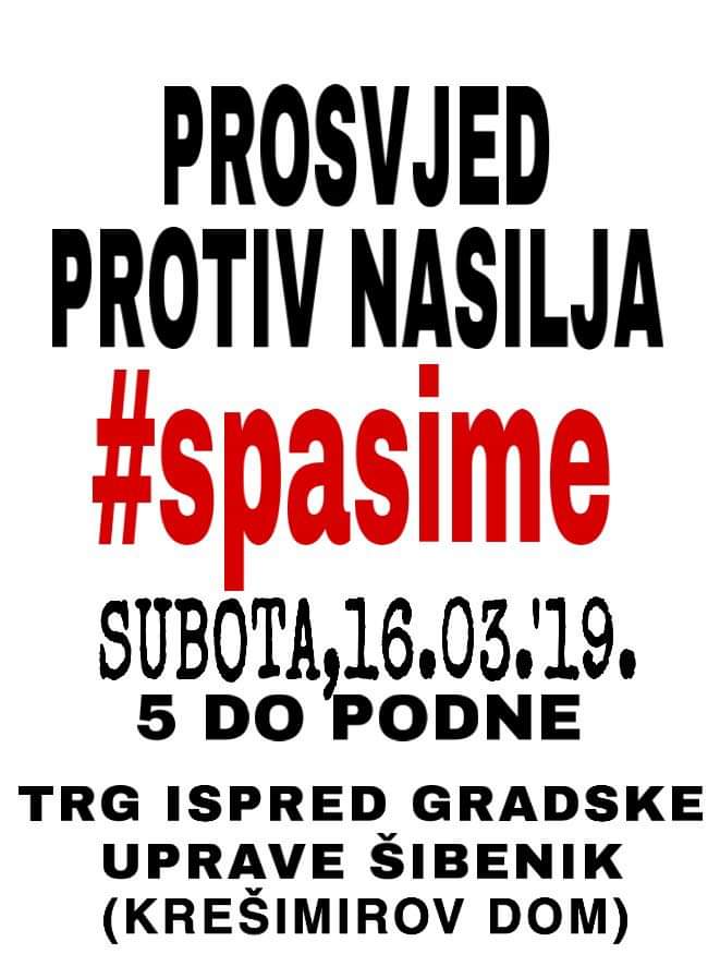 Mirni prosvjed ‘Spasi me’ čiji je cilj pružanje podrške zlostavljanim osobama i osvješćivanje građana o problemima nasilja održat će se u Šibeniku i to u subotu, 16. ožujka, a okupljanje će biti ispred gradske uprave u ‘pet do 12’!
