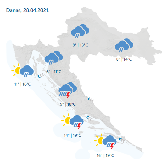 U većem dijelu zemlje pretežno oblačno, osobito u prvom dijelu dana. Mjestimice kiša i pljuskovi, u Dalmaciji lokalno i grmljavina, a prema večeri na sjeverozapadu i Jadranu smanjenje naoblake. Vjetar na kopnu većinom slab. Na sjevernom Jadranu prijepodne slaba do umjerena, podno Velebita i jaka bura, a na srednjem i južnom umjereno do jako jugo. Poslijepodne vjetar u slabljenju. Najviša dnevna temperatura između 11 i 15, na Jadranu od 15 do 20 °C.
