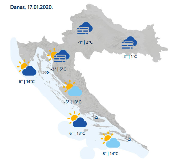 U većem dijelu unutrašnjosti magla i niski oblaci, mjestimice uz rosulju koja se ponegdje ledi u dodiru s tlom, a moguć je i vrlo slab snijeg. U Gorskom kotaru i Lici mjestimice će biti duljih sunčanih razdoblja. Na Jadranu i u unutrašnjosti Dalmacije pretežno sunčano. Vjetar na kopnu slab, na Jadranu slaba do umjerena bura i sjeverozapadnjak, ponegdje i zapadnjak. Najviša dnevna temperatura od -2 do 2 u nizinama, od 2 do 7 u gorju te između 11 i 15 °C na obali i otocima.