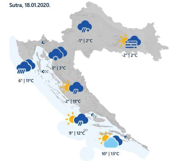 Umjereno do pretežno oblačno, od sredine dana u središnjoj te osobito gorskoj unutrašnjosti mjestimice sa snijegom i susnježicom uz stvaranje snježnog pokrivača. Na većem dijelu Jadrana kiša, češće na sjevernom dijelu, a na jugu će se zadržati uglavnom bez oborine. Vjetar na kopnu uglavnom slab. Na Jadranu će zapuhati umjereno do jako jugo i istočnjak, kasno poslijepodne će na sjevernom dijelu okrenuti na buru i jačati. Najniža jutarnja temperatura zraka od -4 do 0, na Jadranu od 5 do 10, a najviša dnevna od -1 do 3 na kopnu te od 9 do 14 °C duž obale, na otocima i u unutrašnjosti Dalmacije.