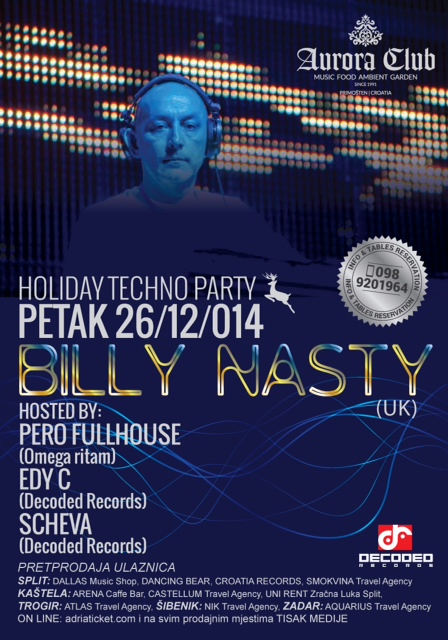 Večer kasnije, odnosno u petak 26. prosinca, elektronskom glazbom zabavljat će nas DJ Billy Nasty. Ulaznica u pretprodaji stoji 50 kuna.