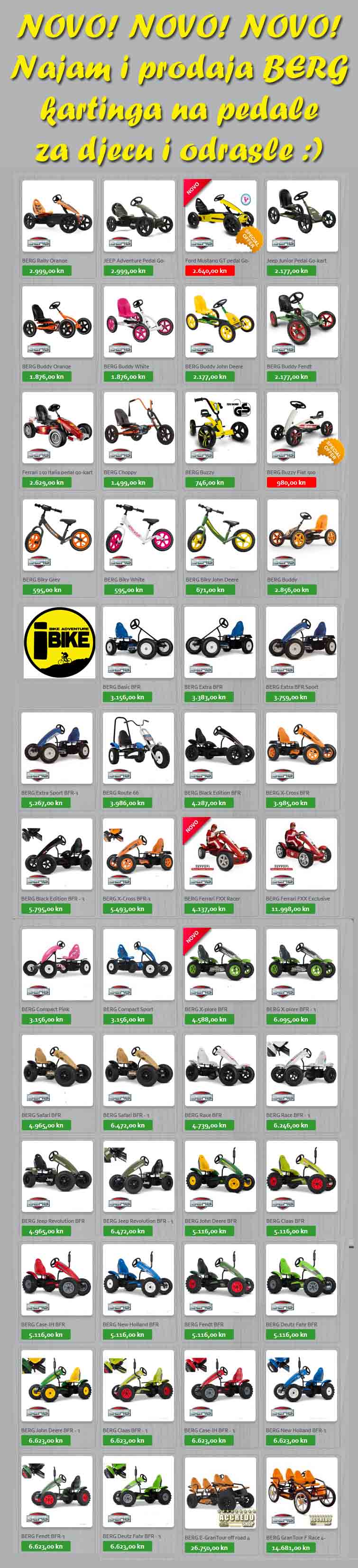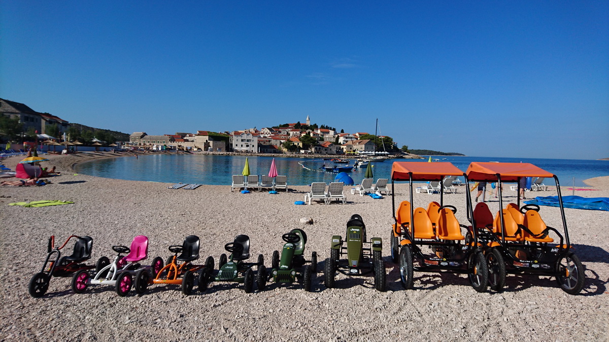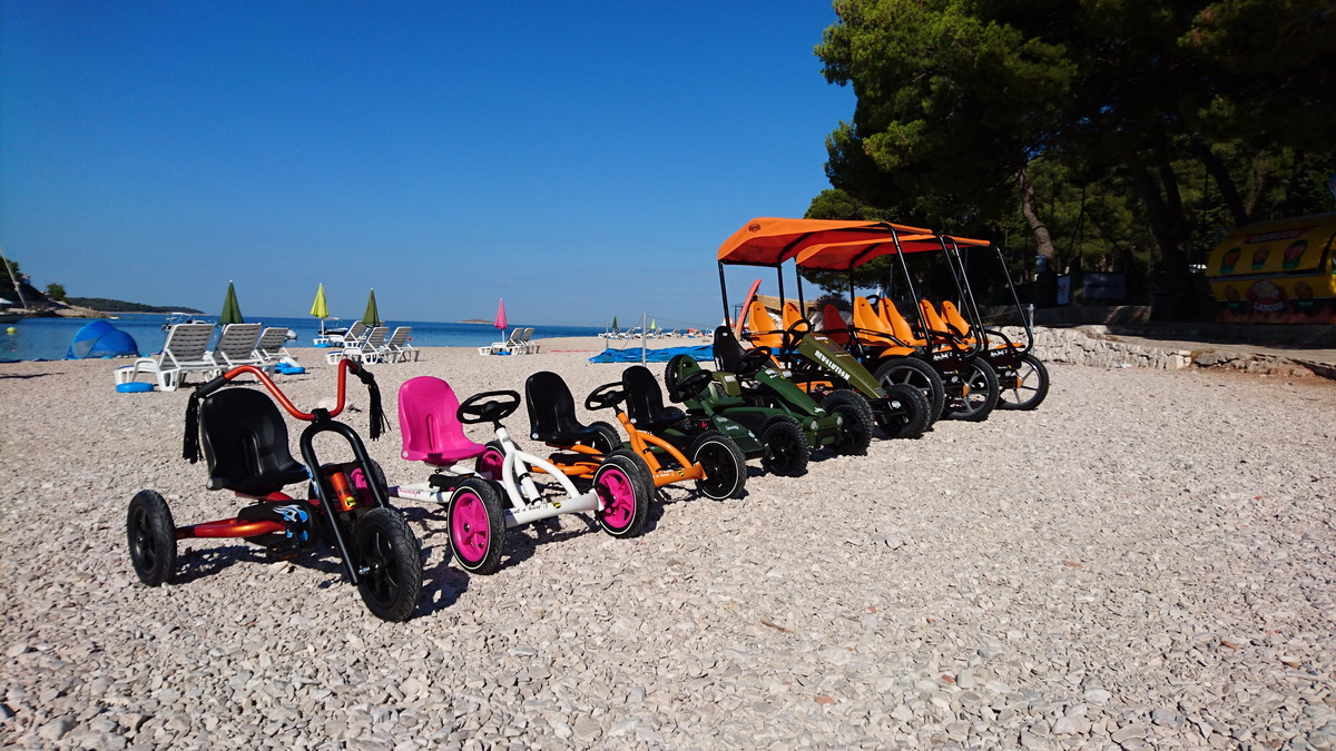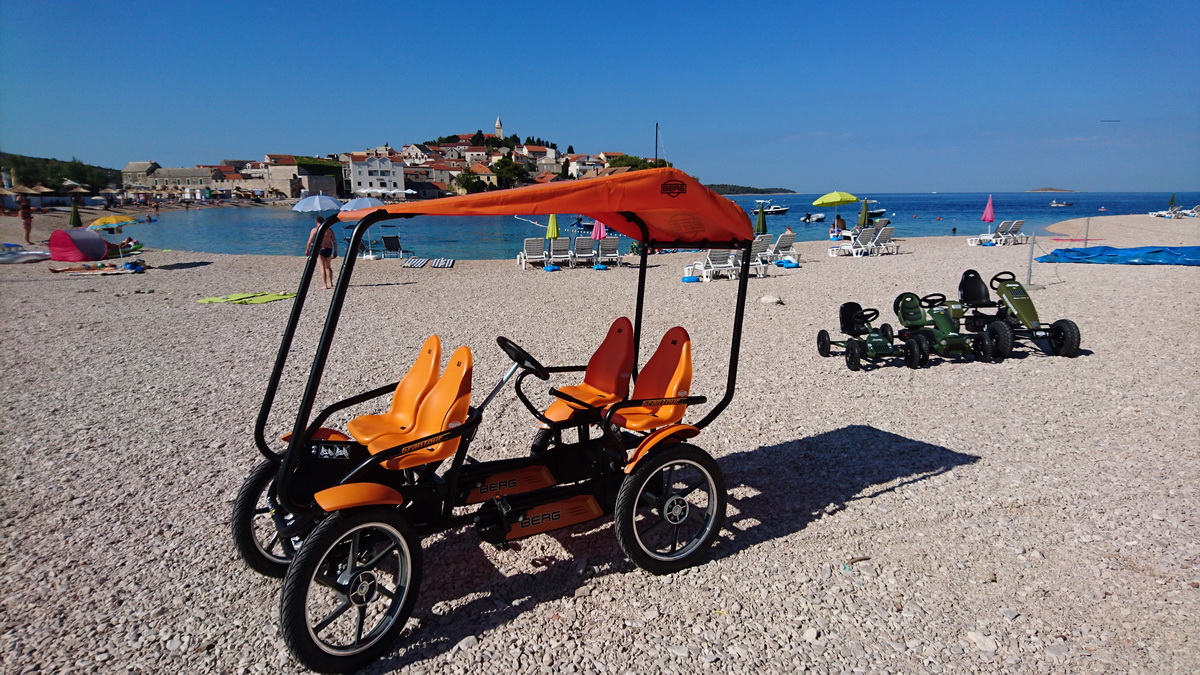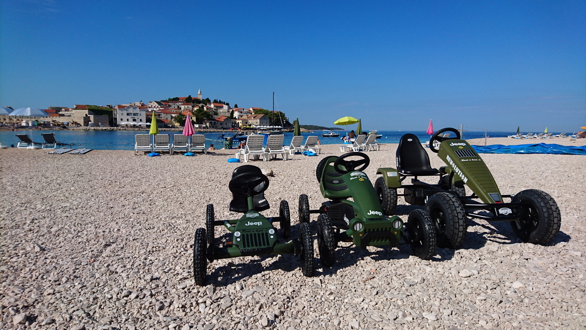 Primošten je od ovog tjedna bogatiji za još jednu ponudu. Na plaži Mala Raduča u rental centru iBike, osim velikog izbora bicikli, sada možete iznajmiti i karting na pedale. Radi se o jako kvalitetnim igračkama nizozemskog proizvođača Berg. Za sada je u ponudi osnovni model “Buddy” prilagođen djeci od 3 – 5 godina. Choppy za djecu od 3 – 6, zatim modeli Jeep za djecu 3 – 5 te 5 – 8 godina starosti. Za stariju djecu te odrasle tu je omiljeni model Jeep revolution, a u ponudi imamo i dva obiteljska modela Gran Tour, koji su pogodni za obitelj s dvoje djece. Osim najma sve modele BERG TOYS igračaka kod nas možete i kupiti.