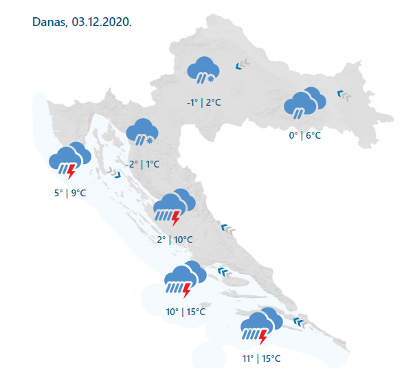 Oblačno s kišom, u zapadnim područjima i snijegom, osobito u gorju, a u Lici, središnjim predjelima i zapadnoj Slavoniji i kiša koja se smrzava u dodiru s podlogom. Oborina će osobito biti obilna u Dalmaciji uz izražene pljuskove i grmljavinu, a lokalno je moguća i tuča. Vjetar na kopnu slab i tek ponegdje umjeren istočni i sjeveroistočni, u Podunavlju jugoistočni. Umjerena i jaka bura na sjevernom će dijelu Jadrana postupno slabjeti i okretati na sjeverozapadnjak, dok će se jako jugo zadržati na krajnjem jugu. Najviša dnevna temperatura od -1 do 4, u istočnoj Slavoniji do 8, a na Jadranu između 9 i 15 °C.