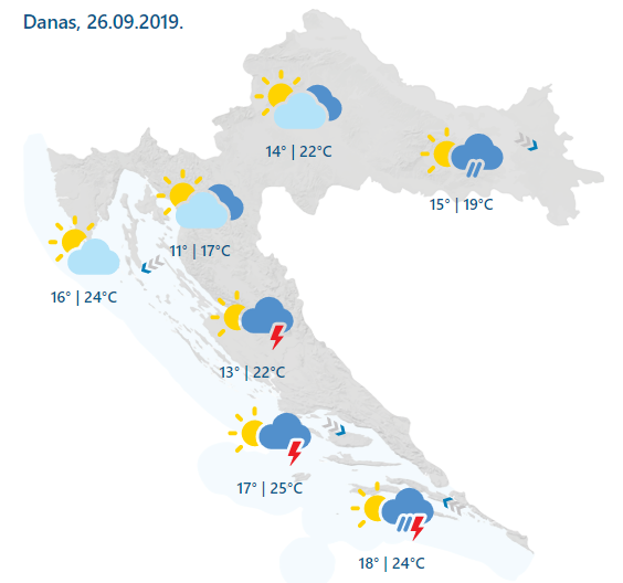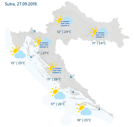 U središnjim i zapadnim predjelima te na sjevernom Jadranu djelomice ili pretežno sunčano. Do sredine dana u Slavoniji te mjestimice u Dalmaciji bit će promjenljivo do pretežno oblačno s kišom ili pljuskovima s grmljavinom, a zatim i tamo barem djelomice sunčano. Vjetar slab, prolazno umjeren sjeverozapadni, poslijepodne u okretanju na jugozapadni. Na sjevernom Jadranu puhat će slaba, još prijepodne umjerena bura, podno Velebita s vrlo jakim udarima, a u Dalmaciji jugo u postupnom okretanju na sjeverozapadnjak. Najviša dnevna temperatura zraka od 17 do 22, a na Jadranu od 22 do 25 °C.