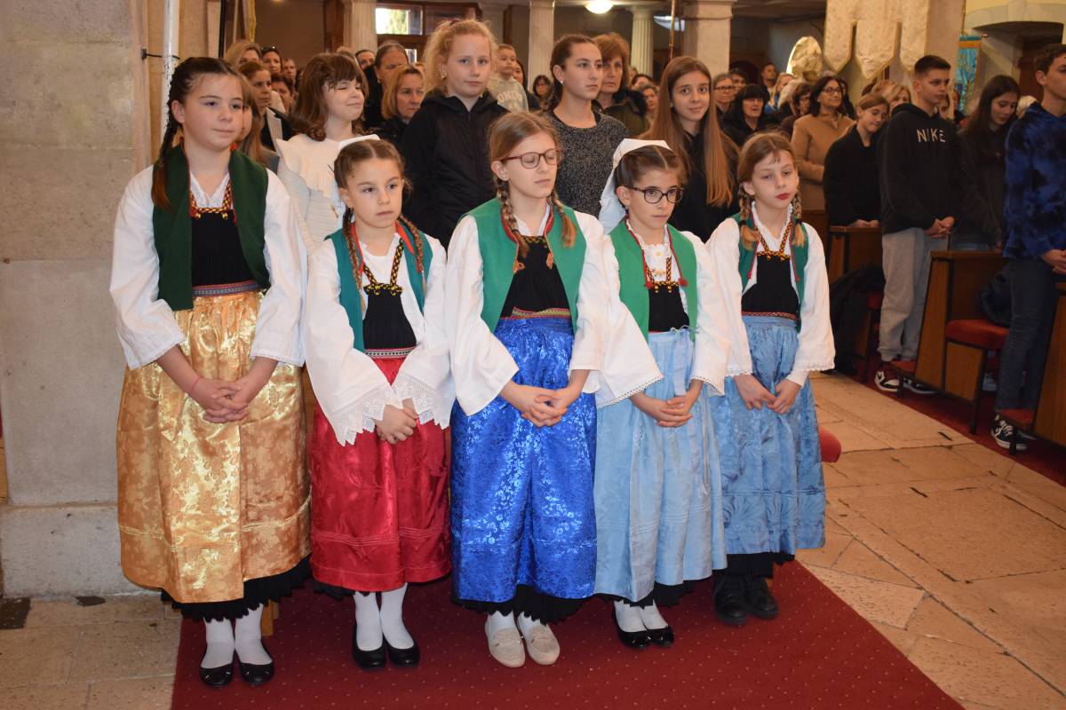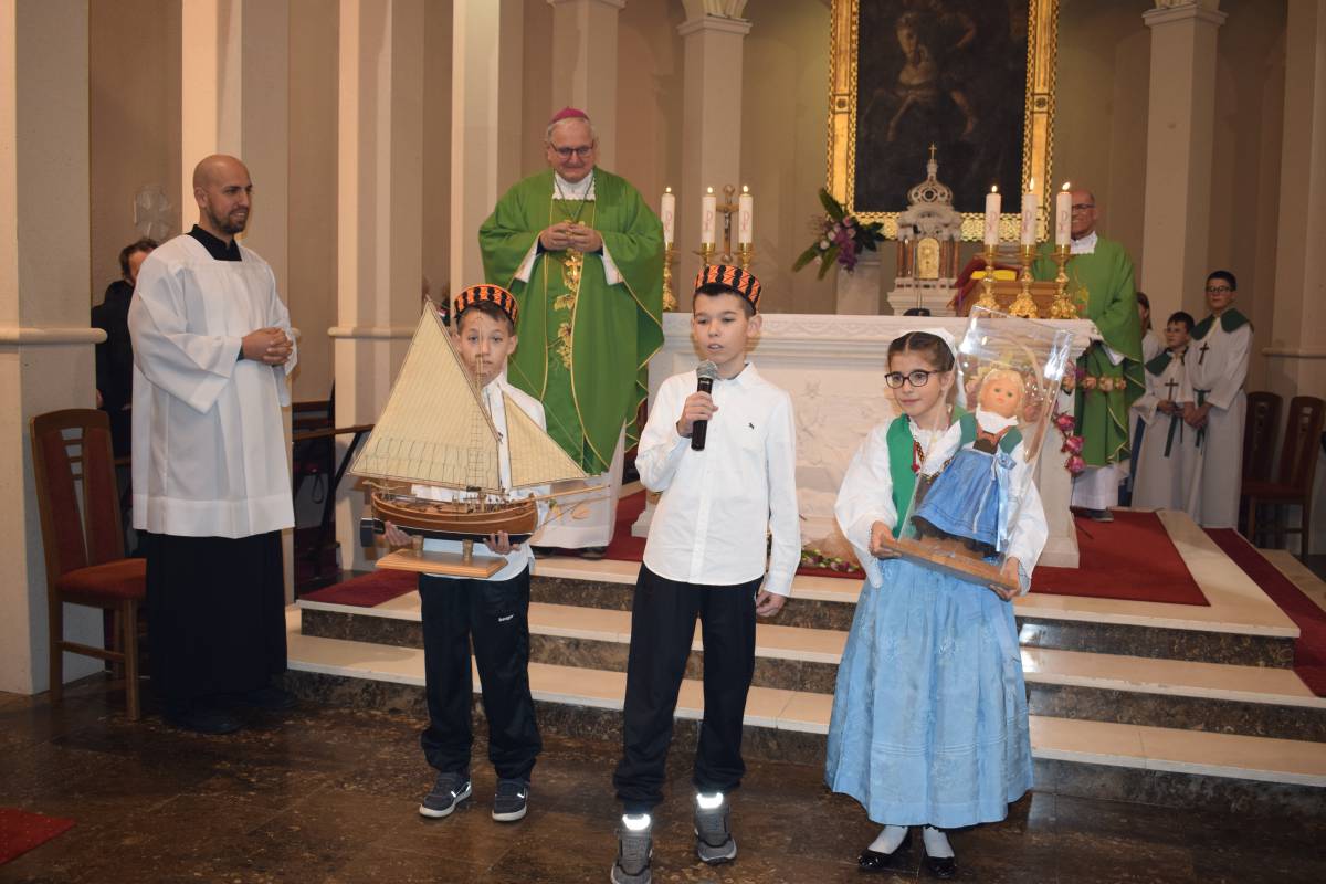 Ocu biskupu darove, u ime župe, su uručili vjeroučenici … lutku-djevojku u primoštenskoj narodnoj nošnji i drvenu maketu bracere-lađe.