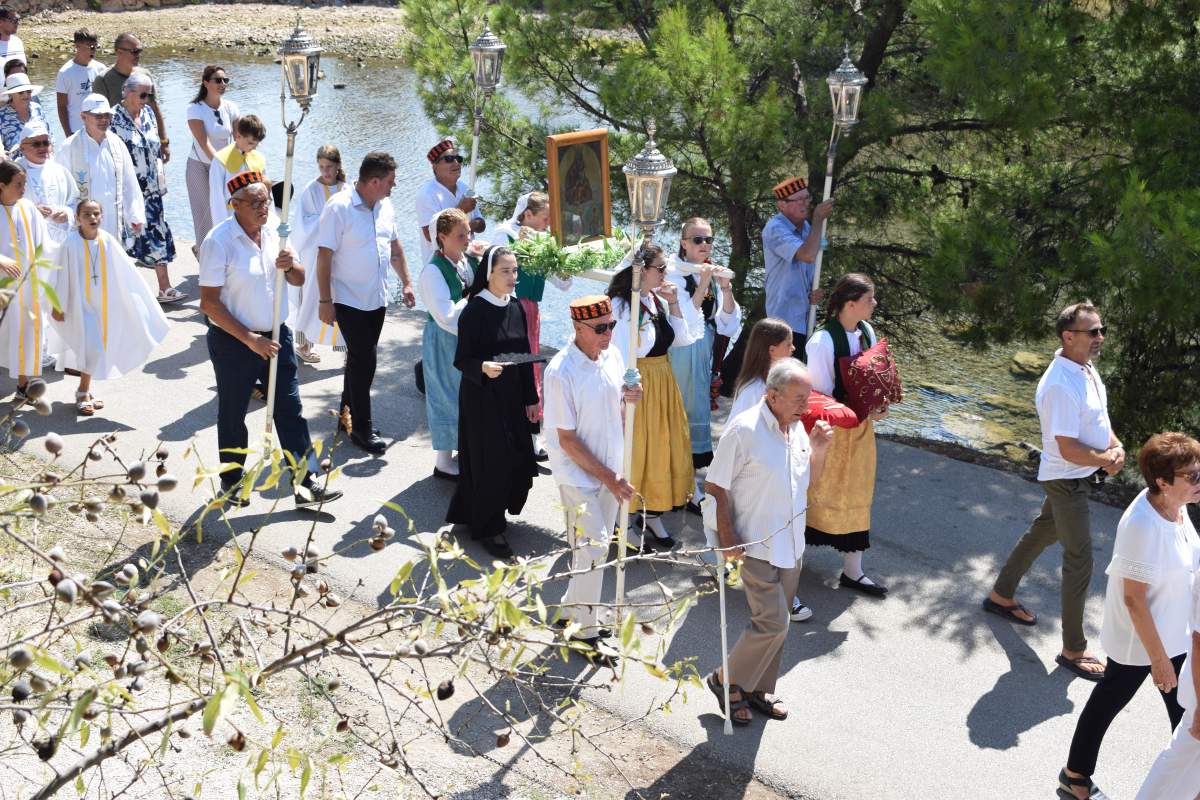 Poslije sv. mise je bila procesija … djevojke u primoštenskim narodnim nošnjama nosile su Gospinu priliku primoštenskim ulicama … kroz Varoš, Ulicom sv. Josipa  kroz Porat do Gospine kapelice u Portu … slijedio je blagoslov puka s likom Majke Božje … obredi su završili pjevanjem himne Majci Domovini.