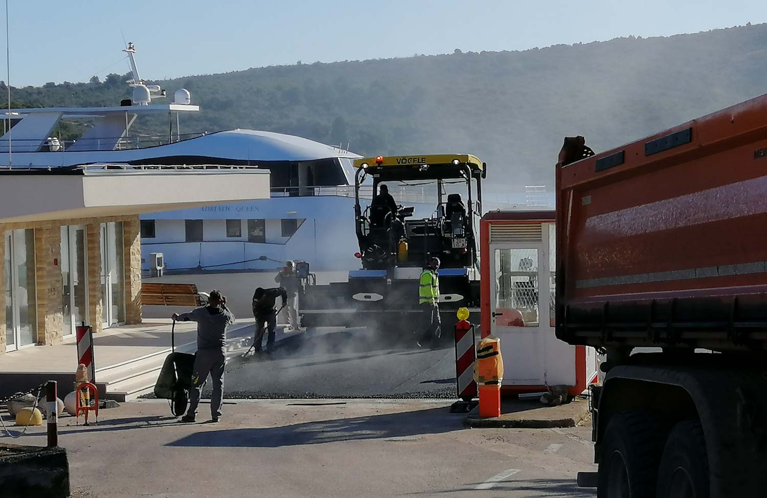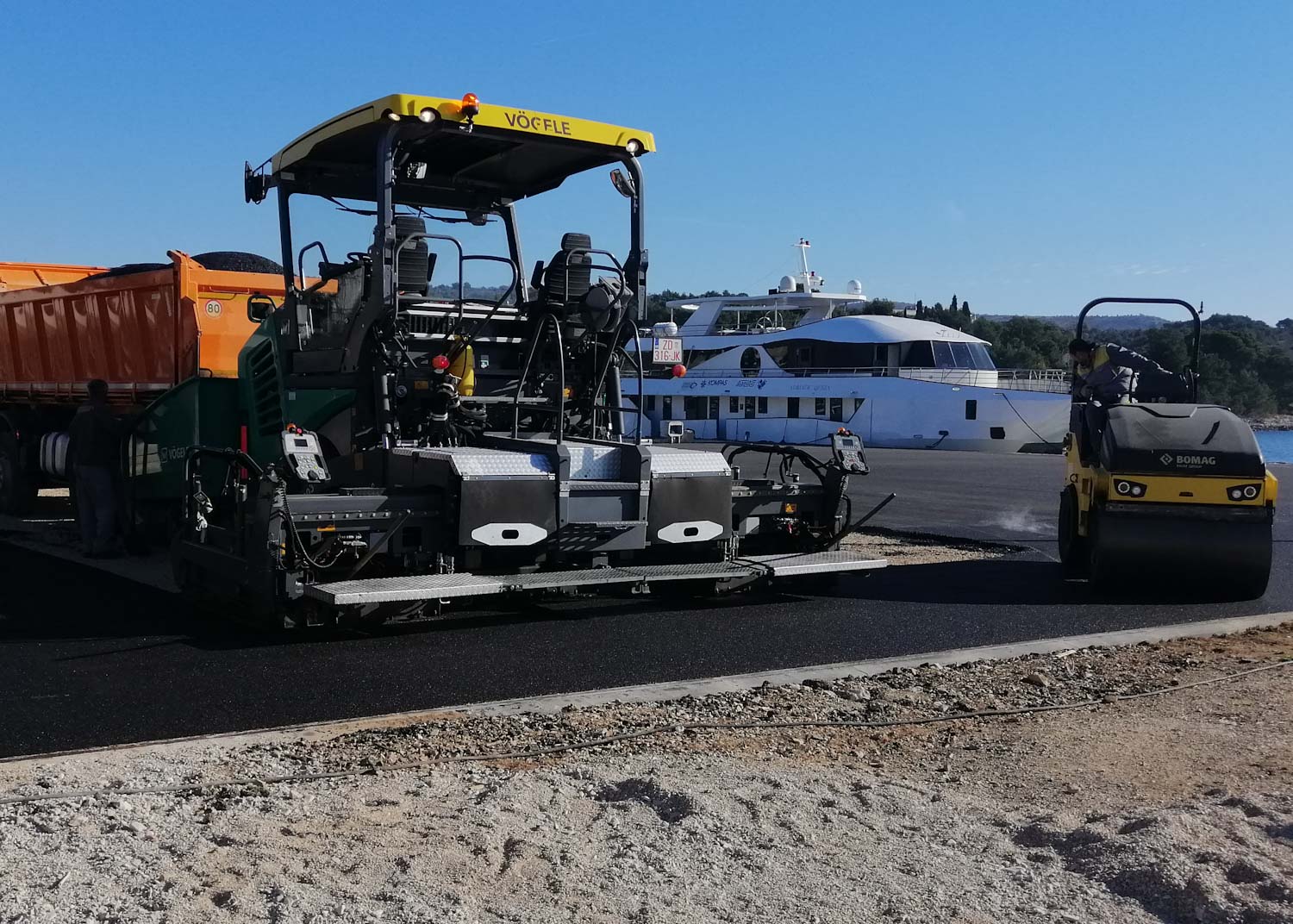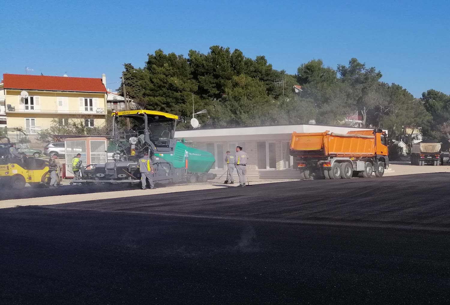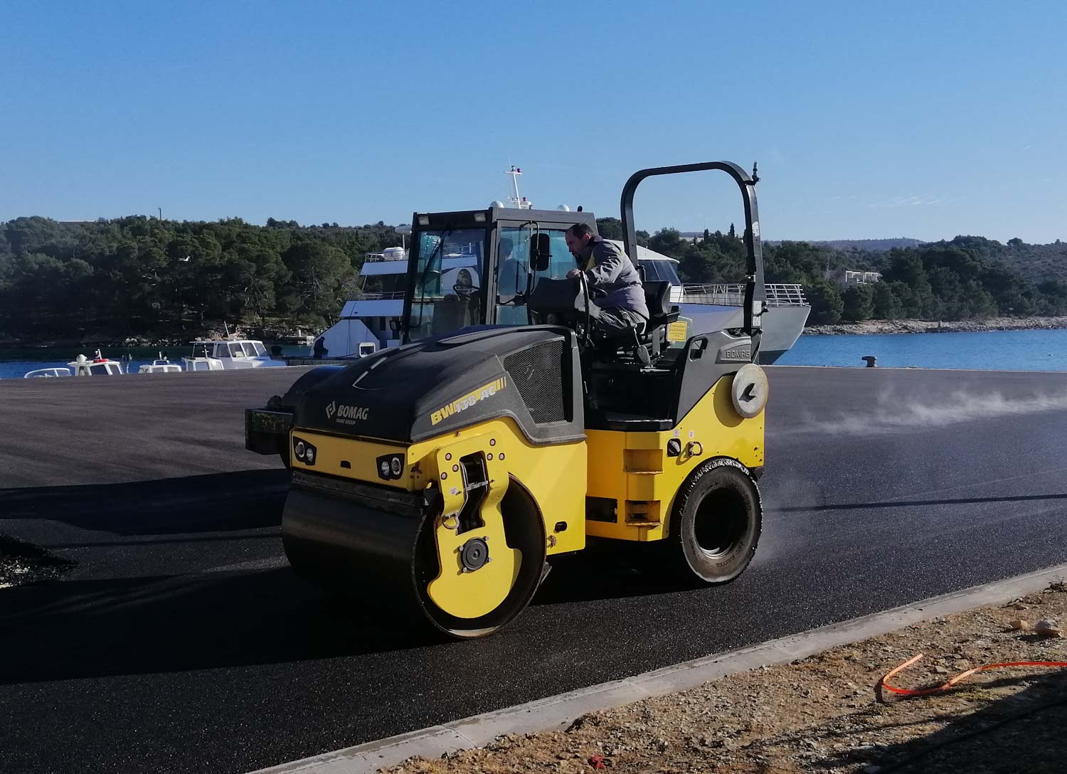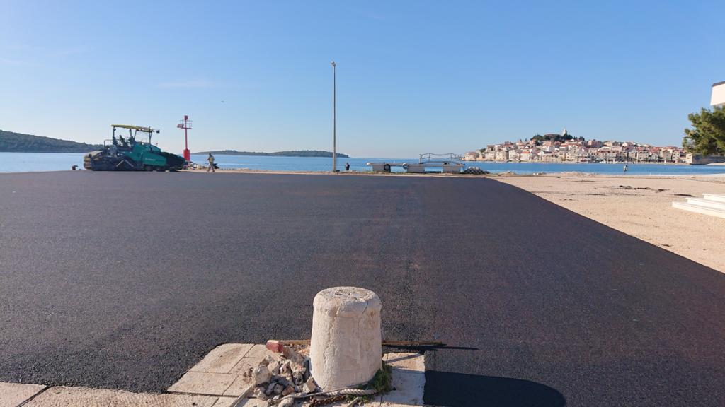 Upravo se dovršava asfaltiranje takozvane nove rive. Stari dotrajali asfalt zamijenjen je novim. Kasnije idu oznake za parking i bit će kao nova. Nema više bosih nogu na rivu, novi crni asfalt ljeti će biti ko gradele 🙂