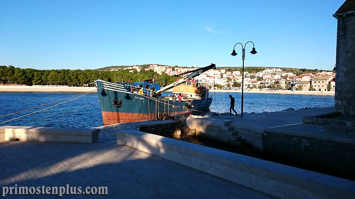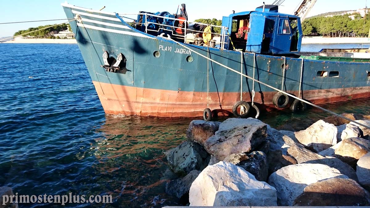 Teretni brod Plavi Jadran kapaciteta nosivosti od 150 tona ovih dana je zadužen za postavljanje velikih kamenih stijena duž lukobrana koji štiti rivu od jakih udara valova. Kakvu snagu imaju valovi na ovom području pokazuje i ova fotografije iz 2015. godine kada su gromade stijena kao od šale nabačene na rivu.
