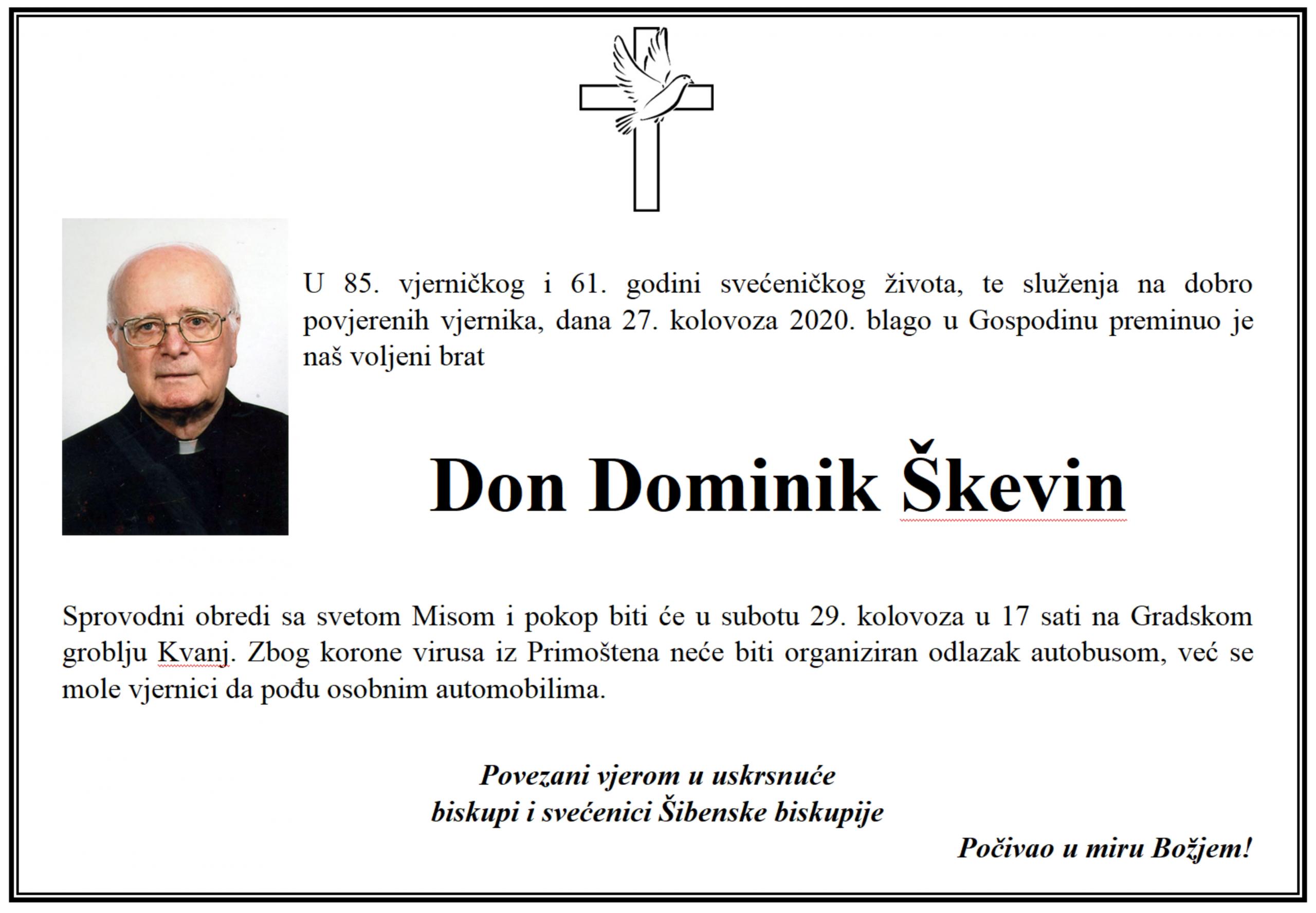Svećenik Šibenske biskupije don Dominik Škevin preminuo je u četvrtak 27. kolovoza 2020. godine u svećeničkom domu u Šibeniku.