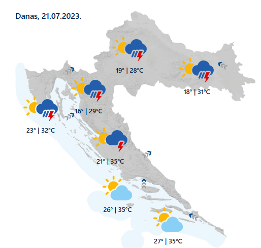 Barem djelomice sunčano i nestabilno. Na zapadu kiša već prijepodne, a od sredine dana pljuskovi i grmljavina u većini kopnenih predjela te na sjevernom Jadranu. Pritom će pljuskovi lokalno biti izraženi, a moguće je i grmljavinsko nevrijeme uz prolazno jak i olujni vjetar, osobito krajem dana. U Dalmaciji pretežno sunčano, a navečer su na sjevernom dijelu mogući pljuskovi. Vjetar slab do umjeren jugozapadni i jugoistočni. Na Jadranu jugozapadni i južni vjetar te jugo. Najviša dnevna temperatura između 27 i 32, na Jadranu od 31 do 36 °C.