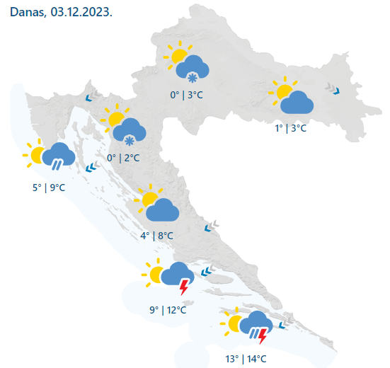Ujutro umjereno do pretežno oblačno mjestimice uz slab snijeg, na moru kišu, a u Dalmaciji su prema otocima lokalno mogući pljuskovi i grmljavina. Zatim postupni prestanak oborine i razvedravanje sa zapada, pa će popodne biti većinom sunčano. Vjetar slab, na istoku i umjeren sjeverozapadni, u gorskim krajevima sjeveroistočni. Na Jadranu umjerena i jaka bura, na udare olujna, a podno Velebita i orkanska. Najviša dnevna temperatura zraka od 1 do 6, na Jadranu između 9 i 15 °C.