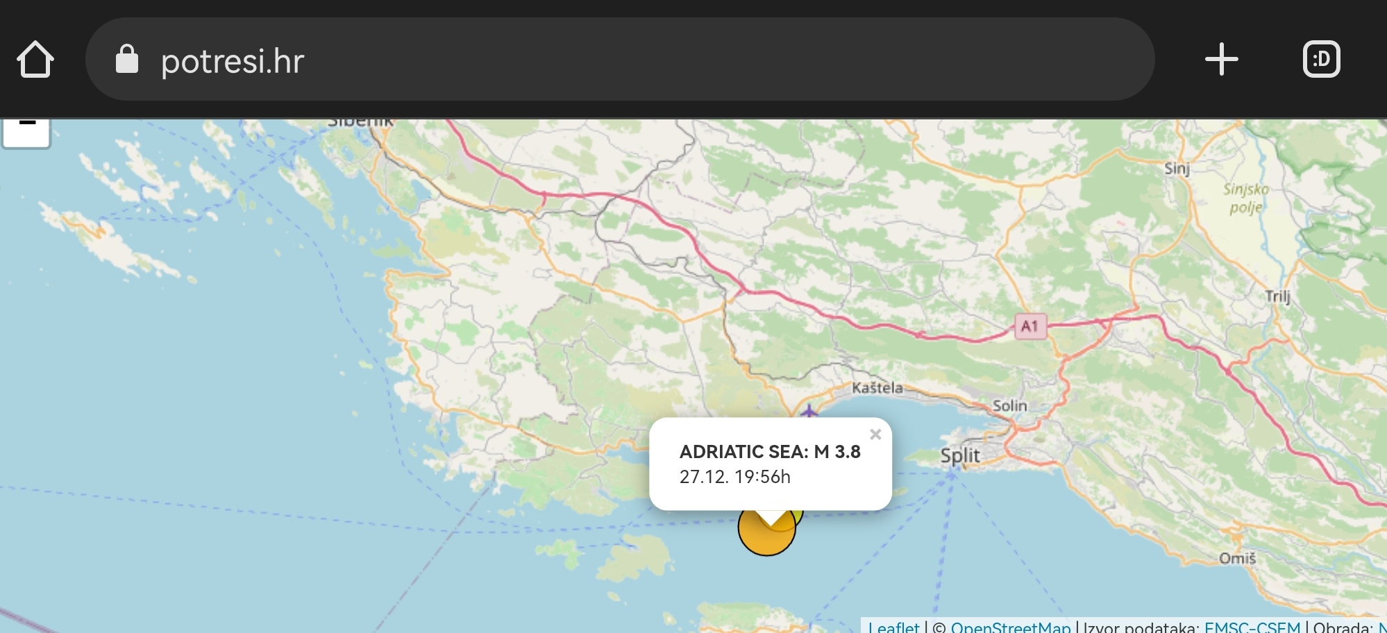 VEČERAS u 19:56 je područje oko Splita zatresao potres magnitude 3.8 po Richteru, javlja EMSC. Potres se osjetio i u Primoštenu.