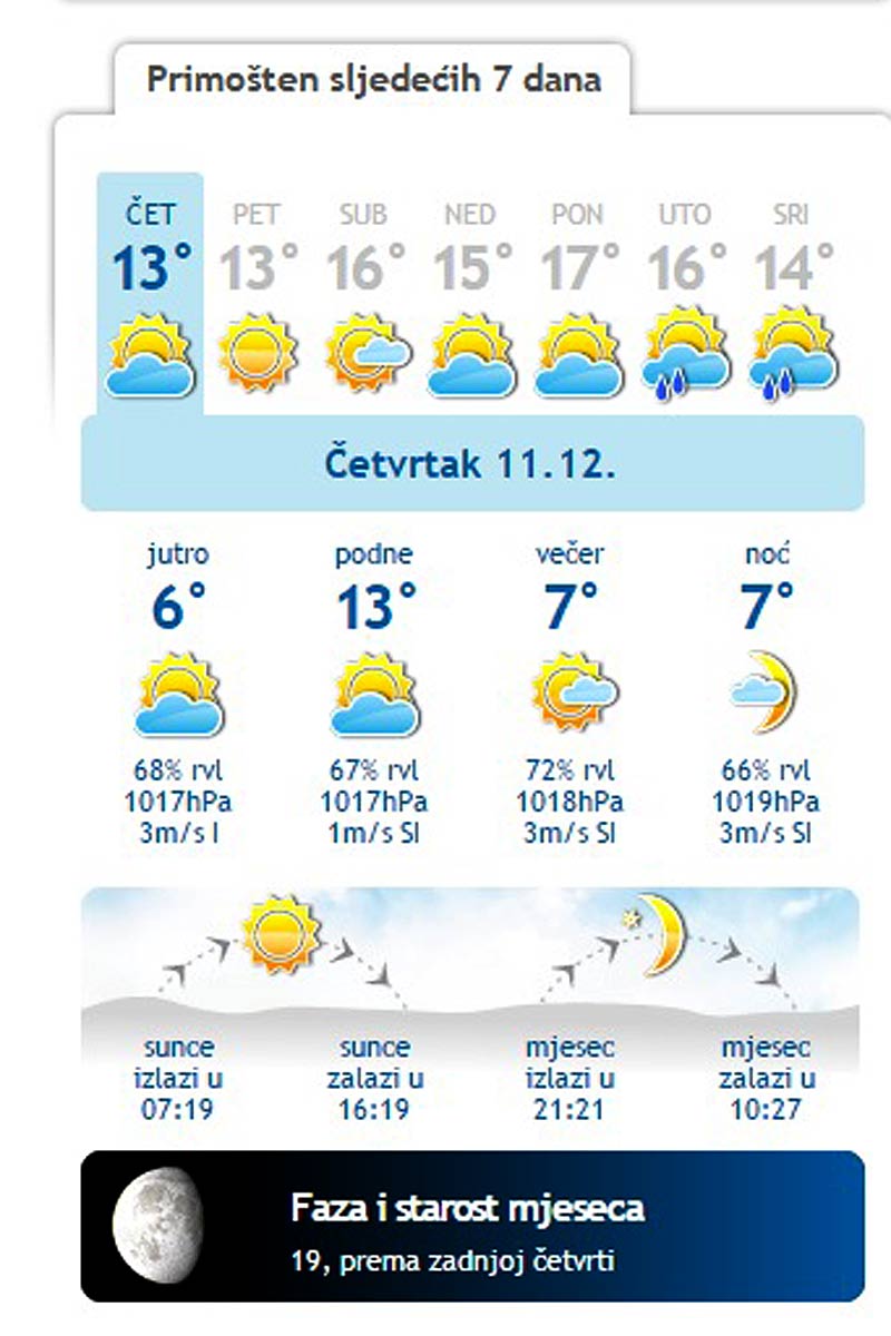 Tijekom dana će biti barem djelomice sunčano. Najoblačnije, samo ponegdje uz mogućnost slabe oborine, bit će u istočnoj Hrvatskoj, najdulje u Podunavlju. Najviša temperatura zraka uglavnom od 1 do 6, u unutrašnjosti Iste i Dalmacije te na Jadranu od 10 do 15 C – piše HRT.hr